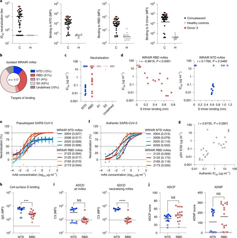Abstract: Prevention of viral escape and increased coverage against severe acute respiratory syndrome coronavirus 2 (SARS-CoV-2) variants of concern require therapeutic monoclonal antibodies (mAbs) targeting multiple sites of vulnerability on the coronavirus spike glycoprotein. Here we identify several potent neutralizing antibodies directed against either the N-terminal domain (NTD) or the receptor-binding domain (RBD) of the spike protein. Administered in combinations, these mAbs provided low-dose protection against SARS-CoV-2 infection in the K18-human angiotensin-converting enzyme 2 mouse model, using both neutralization and Fc effector antibody functions. The RBD mAb WRAIR-2125, which targets residue F486 through a unique heavy-chain and light-chain pairing, demonstrated potent neutralizing activity against all major SARS-CoV-2 variants of concern. In combination with NTD and other RBD mAbs, WRAIR-2125 also prevented viral escape. These data demonstrate that NTD/RBD mAb combinations confer potent protection, likely leveraging complementary mechanisms of viral inactivation and clearance.